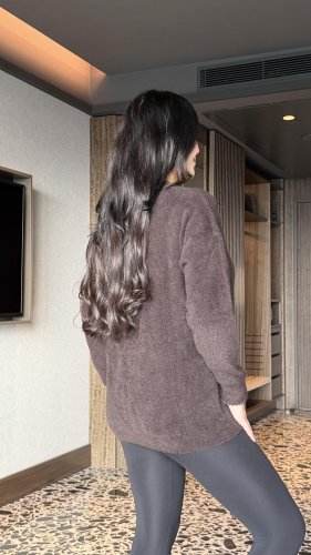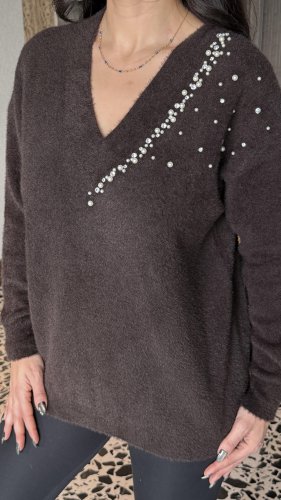 Kadın v yaka uzun kollu inci detay triko bluz
